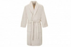 Albornoz liso en color blanco, cuello esmoquin. Presentación en bolsa transparente. Disponibles en el mismo color toallas sueltas (se venden separadamente).