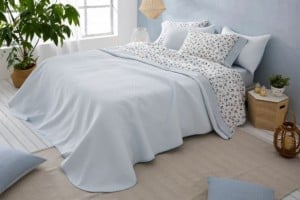 Colcha jacquard en blanco con un diseño de pequeños topitos que dan textura. Tejido ultra suave, cotton touch. La confección es con un ribete blanco en todo el perímetro de la colcha. Ángulos redondeados. Incluye una o dos fundas de cojín rectangular en el mismo tejido.
