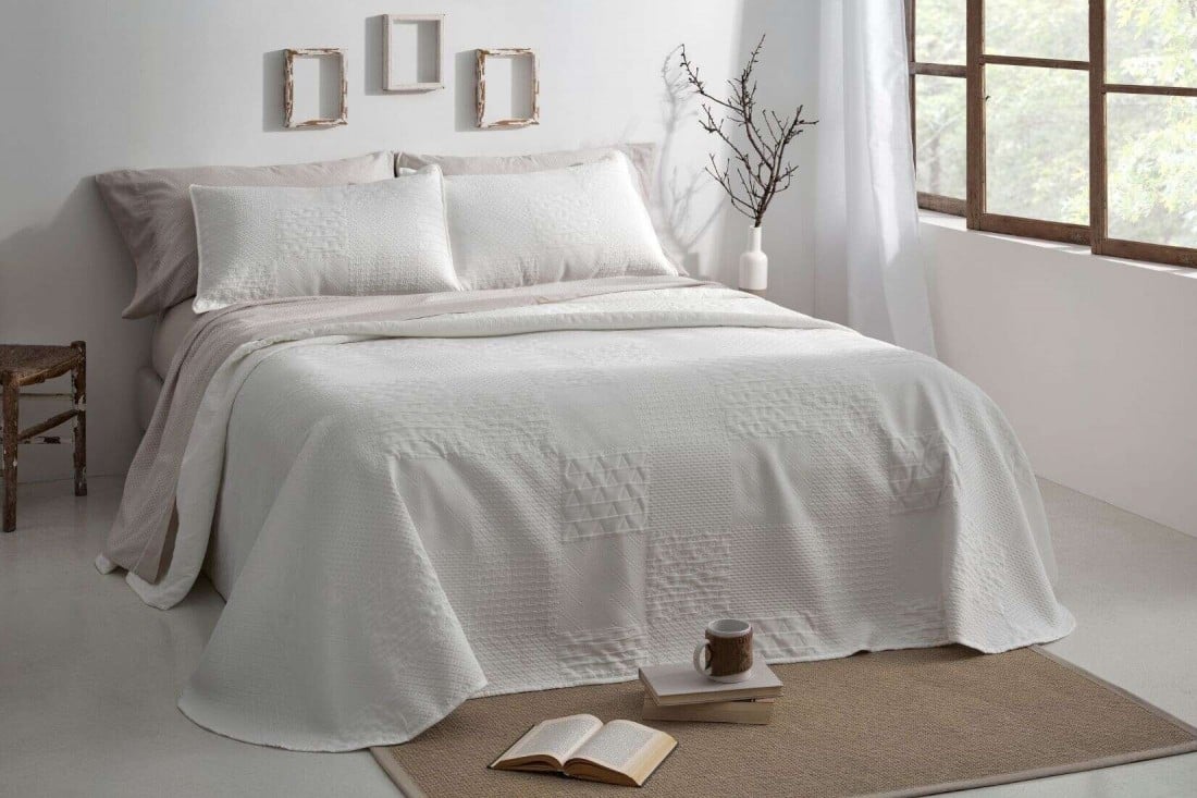 Colcha de verano en color blanco con diseño geométrico tipo patchwork en jacquard: una composición de cuadros y relieves tonales que encaja con la estética minimalista y el estilo Japandi, donde la textura sustituye al exceso de color.