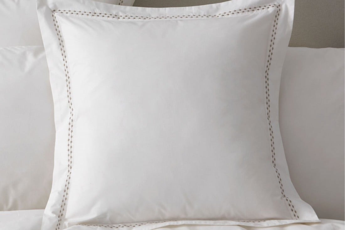 Pack de 2 fundas de cuadrante de estética minimalista en color blanco, realzada con un bordado perimetral de doble pespunte y pequeños óvalos en tono lino. Un detalle sutil que encaja especialmente bien en dormitorios de inspiración mediterránea, donde la luz y la calma se expresan a través de lo esencial.