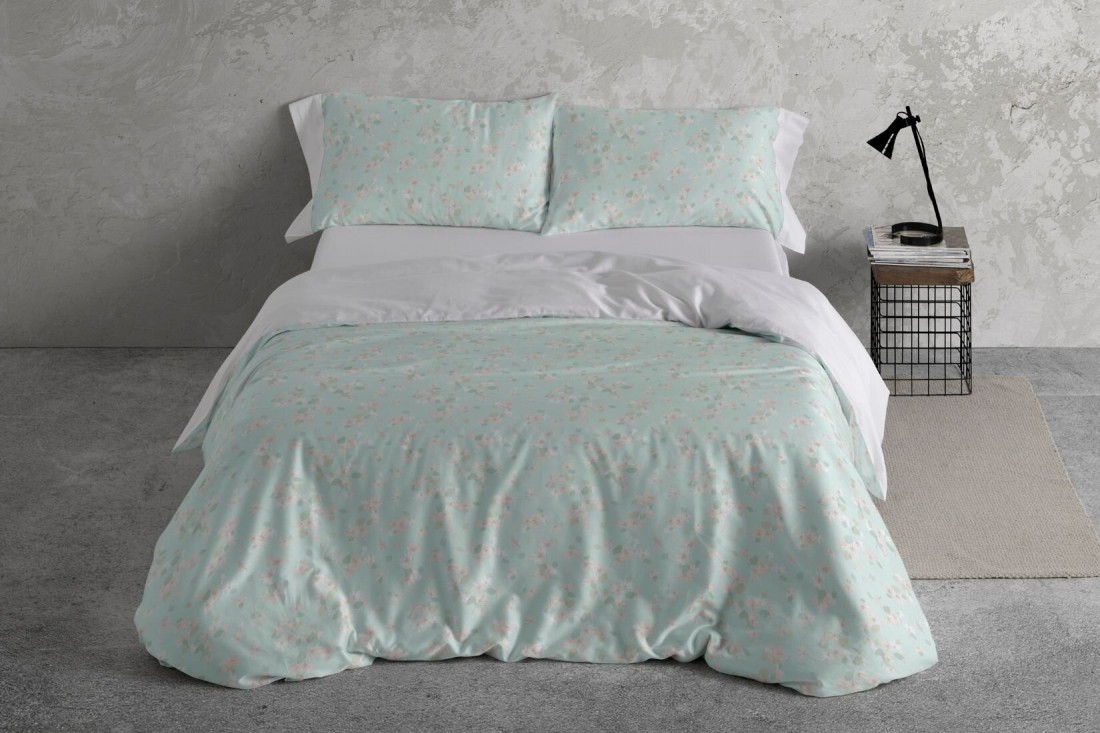 Funda nórdica 100% algodón 200 hilos, estampada en estilo pictórico con flores acuareladas en tonos de maquillaje sobre fondo verde. No incluye bajera.