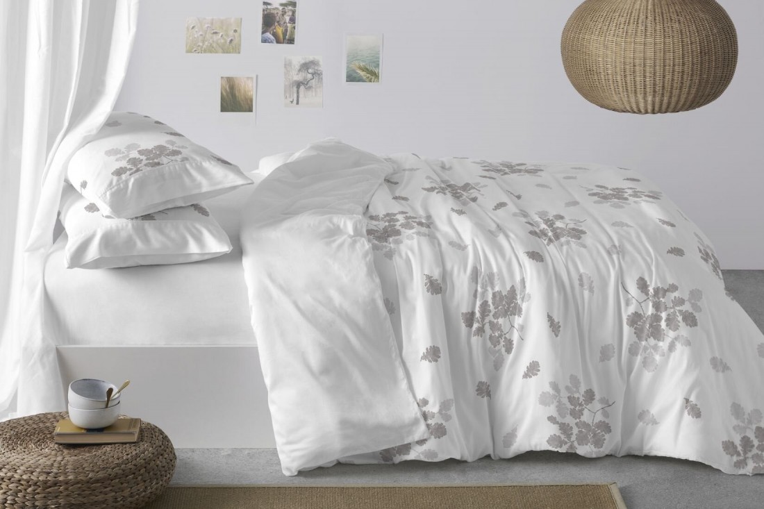 Funda nórdica de aire natural que sugiere una estética minimalista de inspiración nórdica. El estampado de hojas de roble va en dos tonalidades de gris sobre fondo blanco. Una funda nórdica de algodón que muestra un look neutro en clave ecológica. Una funda nórdica que transmite calma, sencillez y conexión con la naturaleza, alineándose de este modo con tendencias en decoración que valoran la sostenibilidad y la armonía.