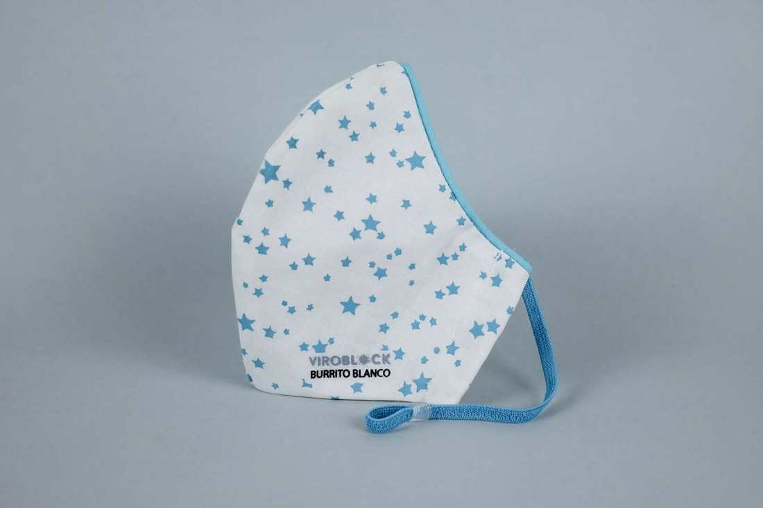 Mascarilla antivirus, con tratamiento Viroblock®. Doble capa de tejido de algodón blanco natural, con estrellitas estampadas, ribete de adorno y gomas en turquesa. Mascarilla antivirus de tejido de algodón. Una mascarilla que previene el contagio por virus y bacterias, incluidos los del Covid-19. Mascarilla de tejido tratado con Viroblock®, que elimina los virus y las bacterias que puedan entrar en contacto con el tejido. Es inocuo con las personas pero eficaz contra los virus y bacterias. Esta mascarilla antivirus es de algodón, lavable, hidrófuga, hipoalergénica ecológica, ya que al poder ser usada hasta en 30 ocasiones. Cumple con la norma UNE 0065:2020. Disponible bolsa de transporte para la mascarilla en el mismo tejido con el acabado Viroblock®. Se vende separadamente.