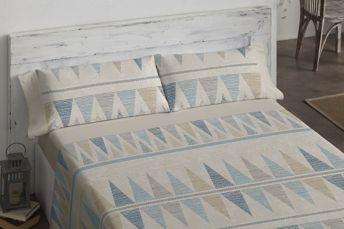 Juego de sábanas de diseño estilo Boho-Chic estampado en tonos azul, gris y piedra. Fundas de la amohada en el mismo diseño de la sábana encimera. Bajera ajustable y aplicaciones de los embozos en color beige liso a juego. El estilo Boho chic se traduciría como diseño de estilo libre: bohemio y a la moda. Diseñar sábanas en este diseño supone mezclar formas y colores traídas de culturas diversas. Un juego de sábanas que se comercializa en 90, 105, 135 y también sábanas 150, 160, 180 y 200 cm. A partir de la medida de sábana de 150 el juego incluye dos fundas de almohada. Se adapta sin problemas a colchones hasta de 32 cm.