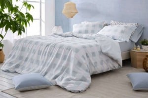 Juego de sábanas con cuadro vichy XXL acuarelado en tono azul pastel sobre fondo blanco, un guiño a la estética escandinava donde el orden y la luz mandan. El embozo con pespunte en azul claro y la almohada a juego refuerzan ese aire artesanal del vichy clásico, actualizado con un acabado suave tipo acuarela.