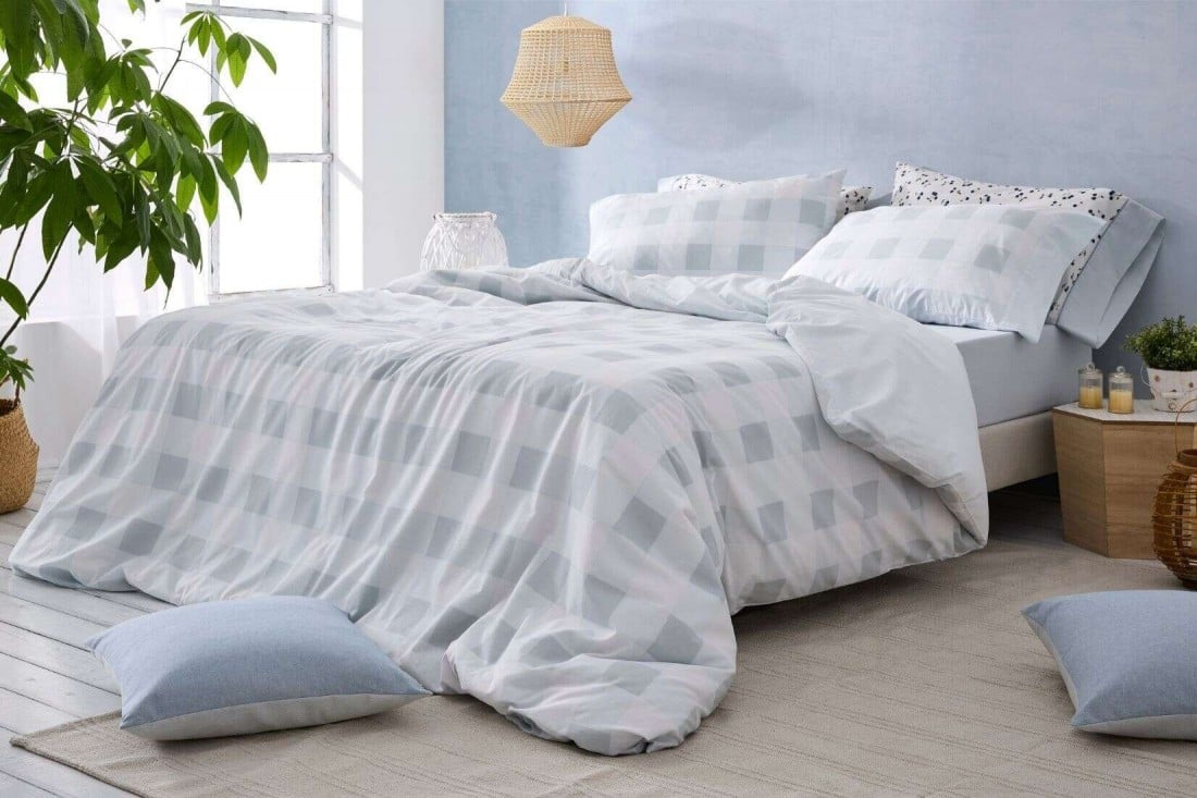 Juego de funda nórdica color azul con diseño geométrico de cuadro vichy XL acuarelado sobre fondo blanco: una lectura contemporánea del damero tradicional, con guiños al minimalismo y al estilo escandinavo por su paleta clara y serena.