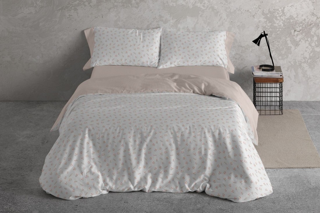 Juego funda nórdica de aire provenzal, con un delicado estampado de florecitas en tonos coral y verde suave sobre fondo blanco, como esas láminas botánicas clásicas reinterpretadas para un dormitorio rústico-chic. El reverso de cuadritos vichy mini en tono teja empolvado sobre beige aporta el contraste sereno propio del estilo escandinavo soft.