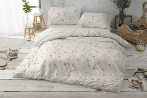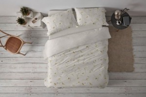 Juego de funda nórdica con un delicado diseño floral de inspiración botánica sobre fondo color crudo con textura tipo papel hecho a mano, muy en línea con la estética Wabi-Sabi y el estilo Japandi. Las ramitas en verde oliva y las flores en tono rosa palo aportan un contraste sereno, con reverso en crudo texturizado para un look más minimalista.