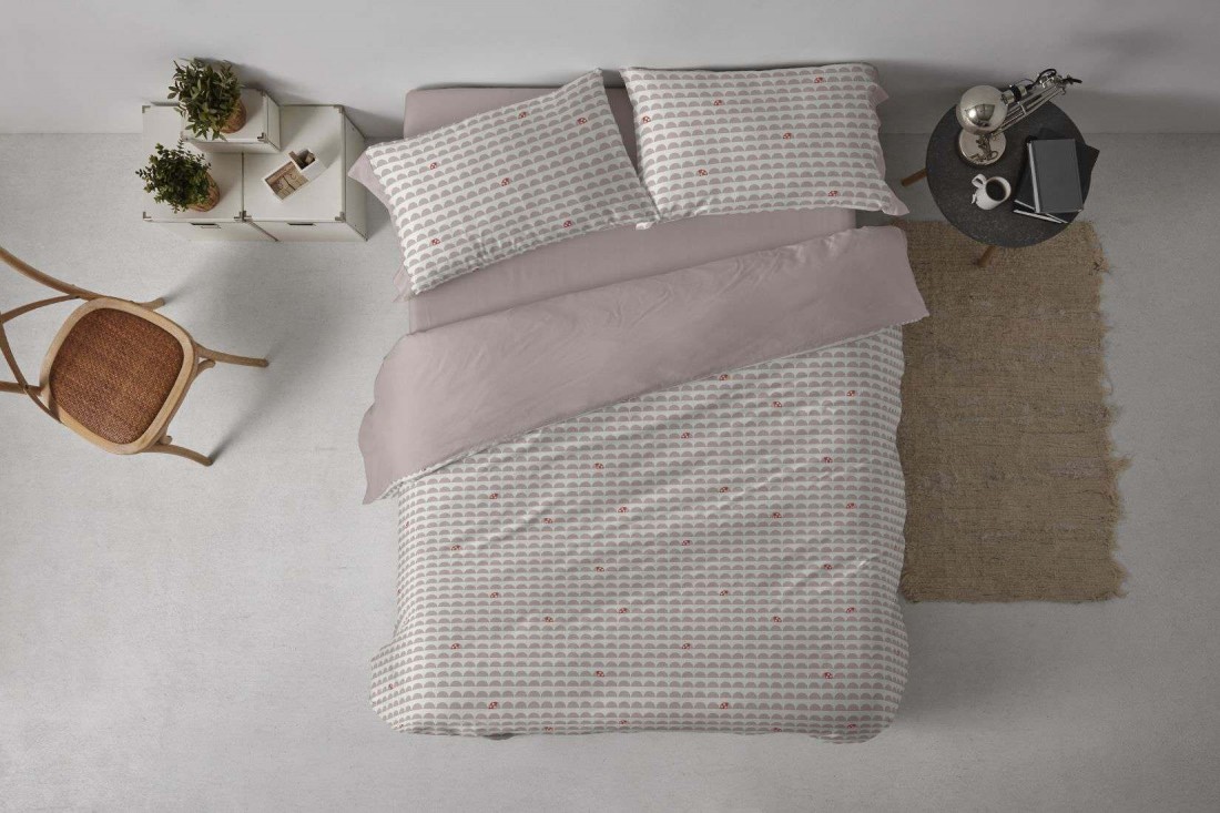 Juego funda nordica de estética geométrica en color lino, con semicírculos ordenados en líneas horizontales que recuerdan al rigor funcional de la Bauhaus y al equilibrio sereno del estilo Japandi. Entre el patrón aparecen pequeñas mariquitas camufladas en tono teja, un guiño lúdico muy escandinavo.