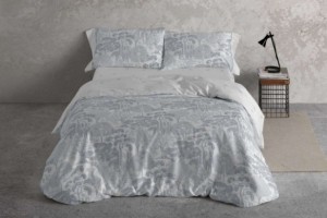 Juego funda nórdica de inspiración japonesa en tono ocre empolvado sobre fondo blanco, con un dibujo de árboles y pequeñas aves que conecta con la estética wabi-sabi y el estilo Japandi: calma, simplicidad y naturaleza en equilibrio.
