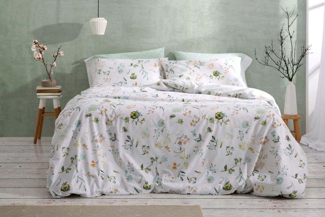 Juego funda nórdica de estética botánica y ligera, con flores acuareladas que recuerdan al trazo suelto del Impresionismo sobre fondo blanco. La paleta combina verdes (menta, oliva y turquesa) con acentos miel y chocolate, y un reverso en tono menta claro que aporta serenidad de inspiración escandinava.