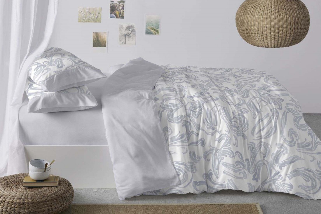 juego funda nordica de estética serena, con un estampado geométrico orgánico de cintas y líneas curvas en color azul grisáceo sobre fondo blanco. Un guiño al Art Nouveau por su trazo ornamental, pero reinterpretado desde el orden calmado del estilo nórdico y la sensibilidad Japandi.