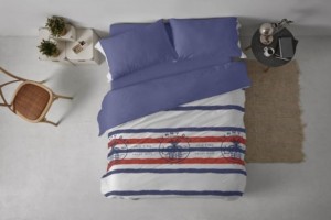 Juego funda nordica de estética surf retro, con rayas horizontales irregulares y grafismos de playa sobre fondo blanco, en una paleta donde el Color azul marino marca el carácter náutico y el rojo aporta energía juvenil. El reverso liso en azul facilita un look más sereno cuando apetece bajar el tono.
