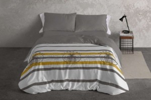 Composición: 50% algodón - 50% poliéster. El algodón aporta un tacto agradable y el poliéster ayuda a mejorar la resistencia al uso y a facilitar el mantenimiento, especialmente el planchado. El diseño presenta anverso estampado con rayas y motivos gráficos; reverso en color gris para un acabado más sobrio. La almohada va en color gris con aplicación en blanco, y la bajera es ajustable en color gris.