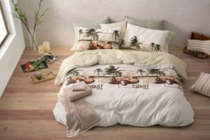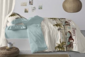 Juego funda nórdica de estética vintage californiana, con paisaje playero en tonos sepia y un beach buggy que aporta el acento en color agua marina sobre fondo beige. El reverso liso en color agua marina equilibra el conjunto y permite alternar el look, ideal para dormitorios coastal retro o boho playero.
