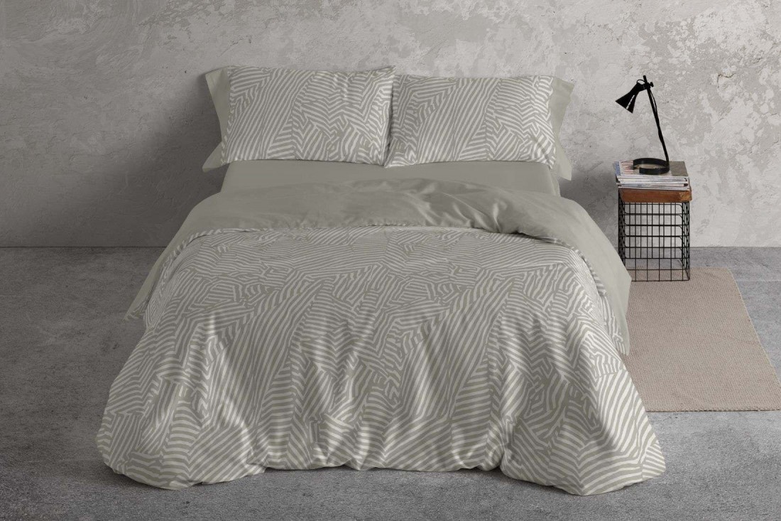 Juego funda nordica en color salvia con un estampado geométrico tipo animal print que recuerda la piel de una cebra, sobre fondo blanco natural. El ritmo de líneas repetidas aporta un guiño al Op Art y encaja de forma natural en ambientes escandinavos, luminosos y serenos.