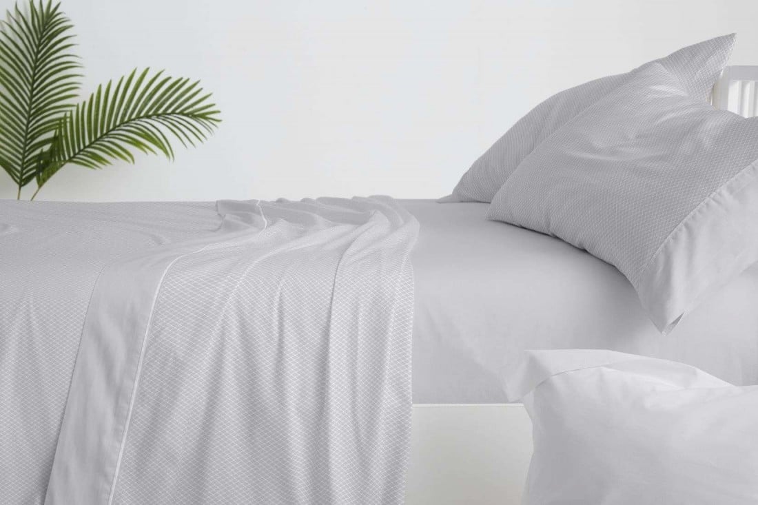 Elegante estampado, en el juego de sábanas, de rombos de fondo gris claro. Sábana encimera con pespunte en embozo gris claro y ribete estampado en blanco. Fundas de almohada con aplicacíon más ribete, también en gris claro al igual que la sábana bajera.