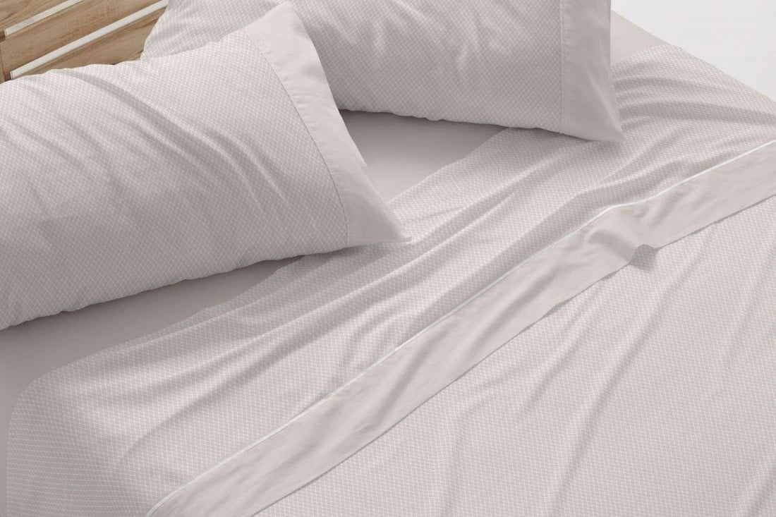 Sábana de rombos blancos sobre fondo arena claro. Un juego de sábanas elegante y discreto, de esos que nunca vienen mal en el armario de la ropa de cama. Encimera de la sábana y bocas de las almohadas, con pespunte en embozo arena claro y ribete estampado en blanco. Sábana ajustable en arena claro liso.