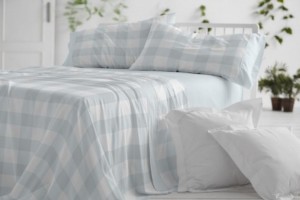 Juego de sábanas con cuadro vichy XXL acuarelado en tono azul pastel sobre fondo blanco, un guiño a la estética escandinava donde el orden y la luz mandan. El embozo con pespunte en azul claro y la almohada a juego refuerzan ese aire artesanal del vichy clásico, actualizado con un acabado suave tipo acuarela.
