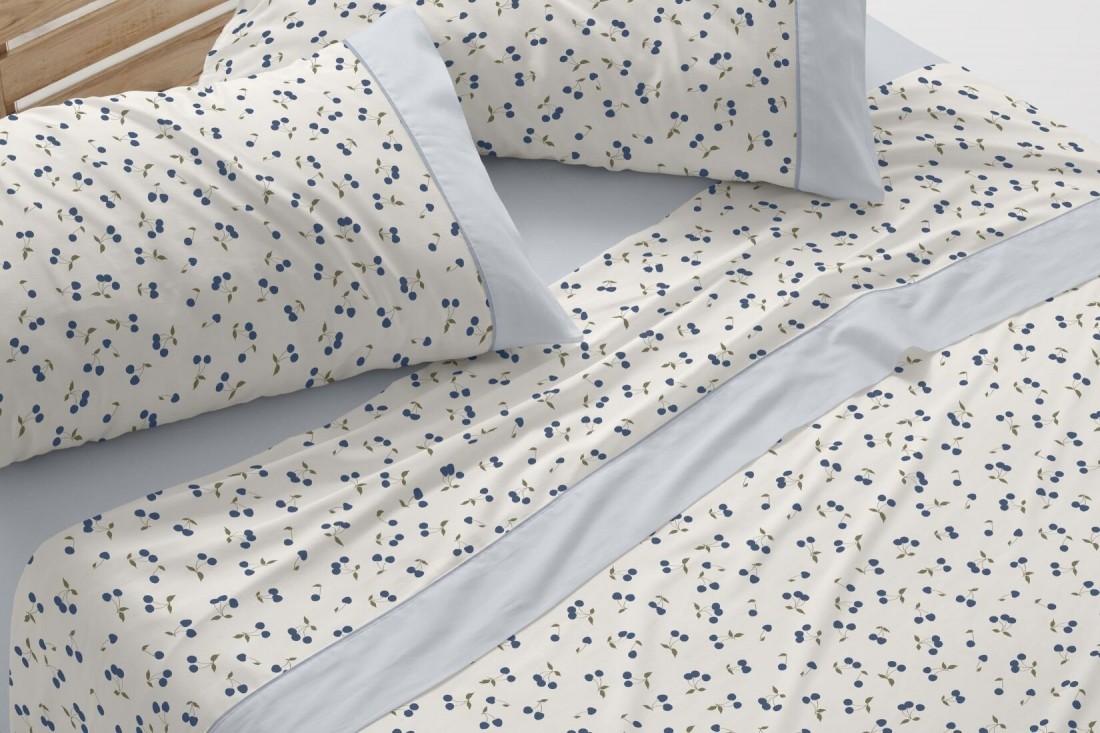 Este juego de sábanas está pensado para quienes buscan una cama bien vestida con un punto decorativo sereno. El motivo de cerecitas y hojas, de lectura botánica y minimalista, funciona como un pequeño patrón artesanal: recuerda a las láminas de herbarios clásicos, pero reinterpretadas con sencillez (muy acorde con interiores Japandi o escandinavos). La paleta combina fondo crudo, azul intenso en la fruta y toques caqui en tallos y hojas, rematada con aplicaciones en azul grisáceo claro para un acabado equilibrado.