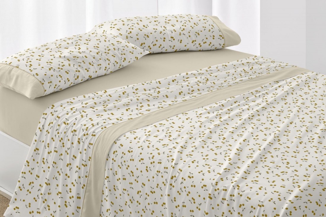 Juego de sábanas color mostaza con diseño botánico de pequeñas cerezas y hojitas sobre fondo crudo, como una ilustración botánica clásica reinterpretada con aire craft y la serenidad cálida del estilo Japandi. La encimera y la almohada repiten el estampado y rematan con aplicación en tono camel claro y ribete a juego; la bajera ajustable va lisa en tono camel para equilibrar el conjunto.