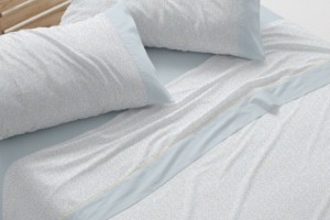 Juego de sábanas de inspiración provenzal, con hojitas delicadas en color beige y pequeñas flores redondeadas en tono turquesa atalcado sobre fondo blanco, como una lámina de botánica clásica llevada al textil. El embozo beige con pespunte y el ribete estampado aportan un acabado cuidado que encaja tanto en dormitorios románticos como en ambientes japandi.