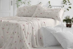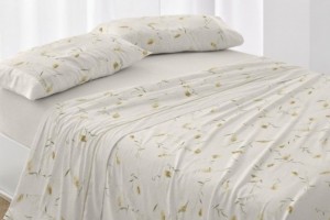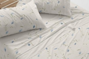 Juego de sábanas de inspiración botánica en tono crudo con matices gris claro que imitan el papel artesanal, sobre el que aparecen ramitas finas en verde y pequeñas flores en color ocre. Un equilibrio sereno muy wabi-sabi, perfecto para ambientes Japandi y dormitorios de estética natural.