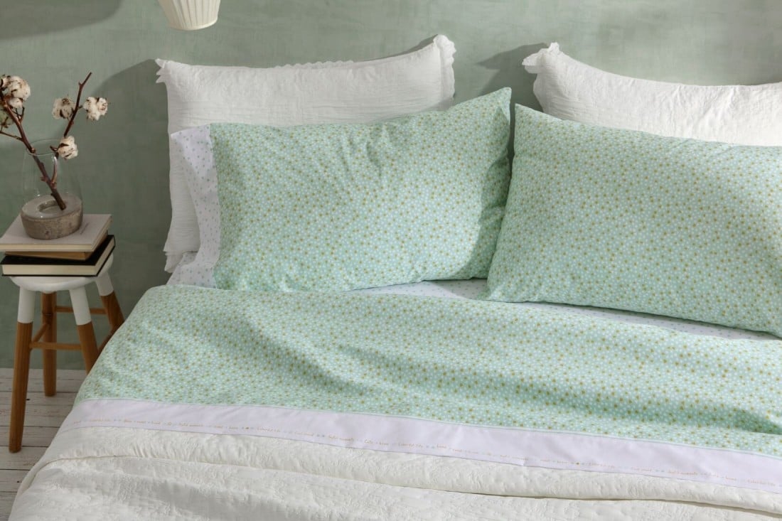 Juego de sábanas color verde con un microestampado de florecitas naíf en ocre y blanco, de inspiración escandinava: una botánica sencilla y repetitiva que aporta calma visual al dormitorio.