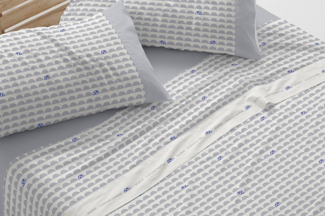 Juego de sábanas de estilo nórdico con un patrón de semicircunferencias en líneas horizontales, en tono azul grisáceo sobre fondo crema. El guiño lúdico lo ponen pequeñas mariquitas en azul intenso y mensajes positivos en el embozo, una mezcla muy Bauhaus por su orden geométrico y muy Japandi por su equilibrio sereno.