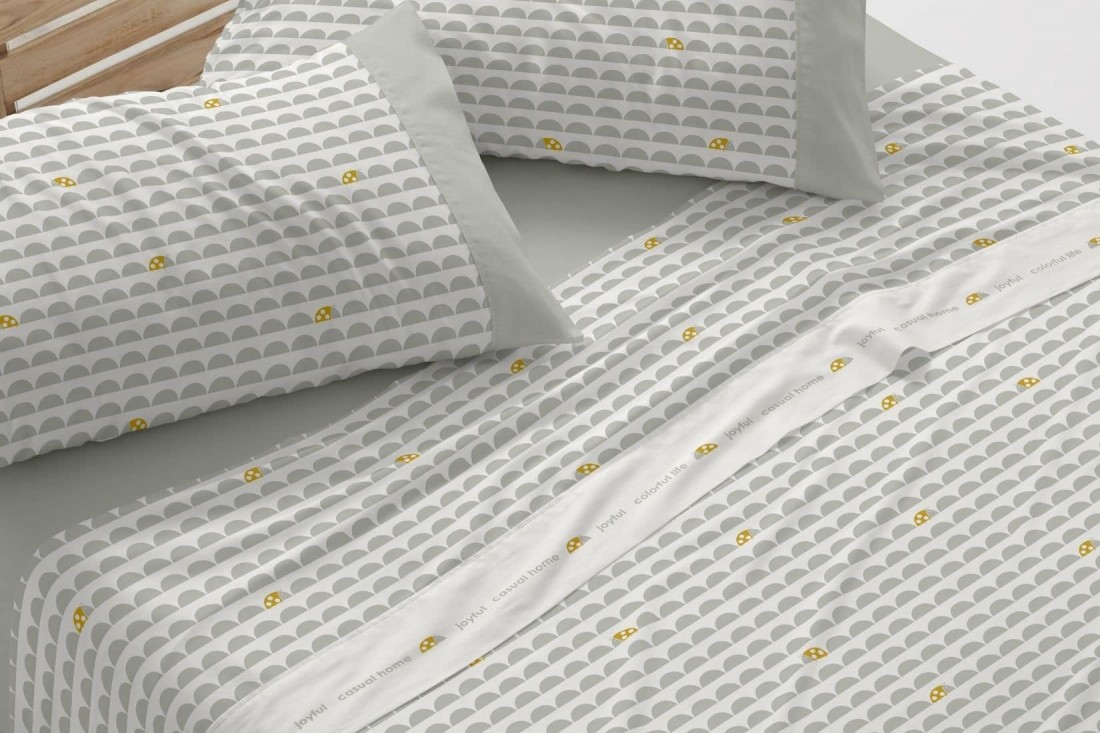 Juego de sábanas con un diseño geométrico de semicírculos en tono laurel, ordenados en líneas horizontales y salpicados con pequeñas mariquitas color mostaza. Un guiño entre Bauhaus y el escandinavismo: formas puras, ritmo visual y un punto lúdico que aporta calidez al dormitorio.
