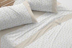 Juego de sábanas de inspiración botánica en tono crudo con matices gris claro que imitan el papel artesanal, sobre el que aparecen ramitas finas en verde y pequeñas flores en color ocre. Un equilibrio sereno muy wabi-sabi, perfecto para ambientes Japandi y dormitorios de estética natural.