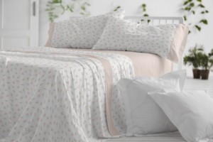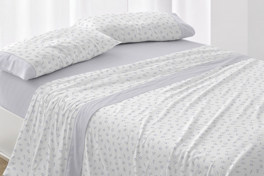 Juego de sábanas de estilo provenzal en tono azul sobre fondo blanco, con florecitas menudas que recuerdan a los jardines luminosos del impresionismo. El conjunto se remata con una aplicación de cuadros vichy mini y ribete en azul grisáceo, aportando ese aire craft y mediterráneo tan fácil de integrar en dormitorios románticos o rústico chic.