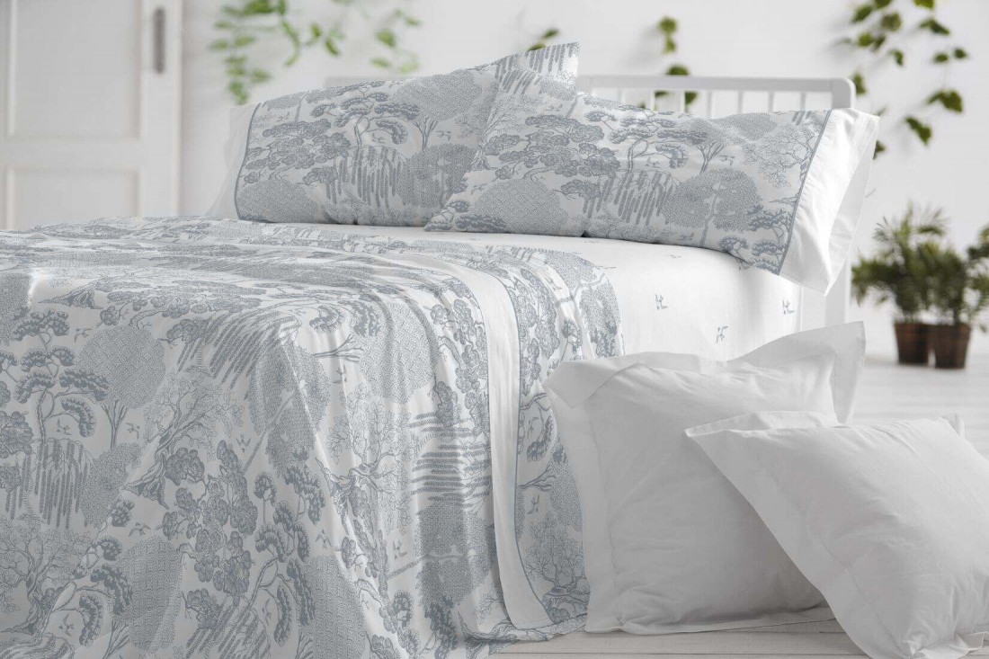 Juego de sábanas con un estampado botánico de inspiración japonesa en tono azul grisáceo sobre fondo blanco, evocando la delicadeza monocromática del Toile de Jouy y la calma del wabi-sabi en clave Japandi. La encimera y la funda de almohada repiten el paisaje de árboles, rematado con aplicación blanca y ribete en azul grisáceo; la bajera incorpora un sutil motivo de pajaritos a juego.