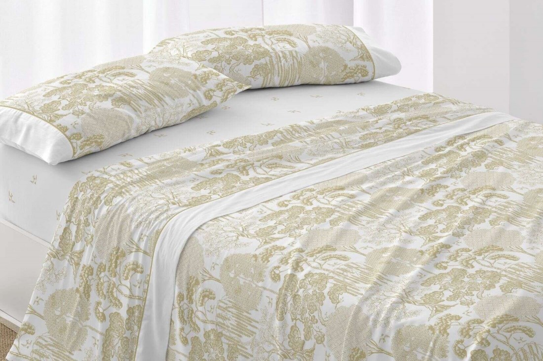 Juego de sábanas en tono ocre empolvado y fondo blanco con un estampado de árboles de aire japonés, entre el Toile de Jouy y la serenidad wabi-sabi, ideal para un dormitorio Japandi o clásico renovado.
