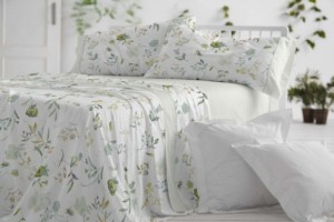 Juego de sábanas con estampado floral de aire acuarelado en una paleta de azules sobre fondo blanco, con notas en verde suave, malva y granate. El efecto recuerda a la pincelada ligera del impresionismo y a los antiguos cuadernos de botánica, perfecto para un dormitorio sereno de estética Japandi.