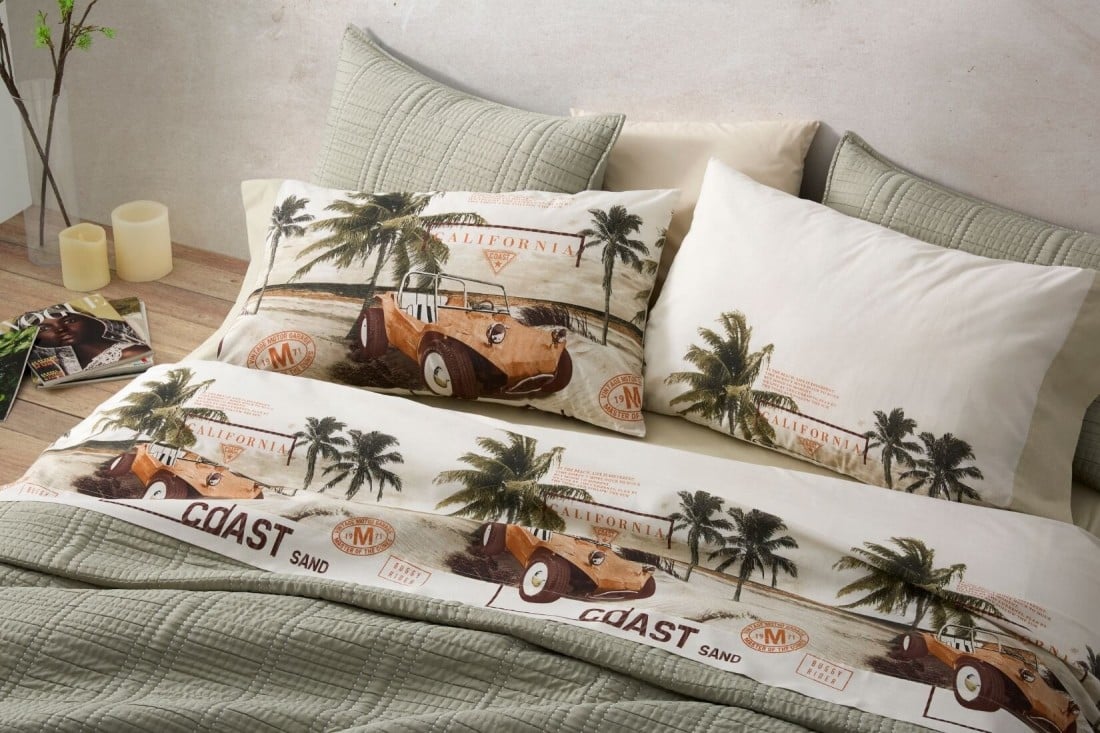 Juego de sábanas de estética retro con un paisaje playero ilustrado en tonos sepia y fondo beige, salpicado por el toque fresco del beach buggy y la aplicación en color agua marina. Un guiño al imaginario californiano de los 60-70 y al boho costero, perfecto para dormitorios informales.