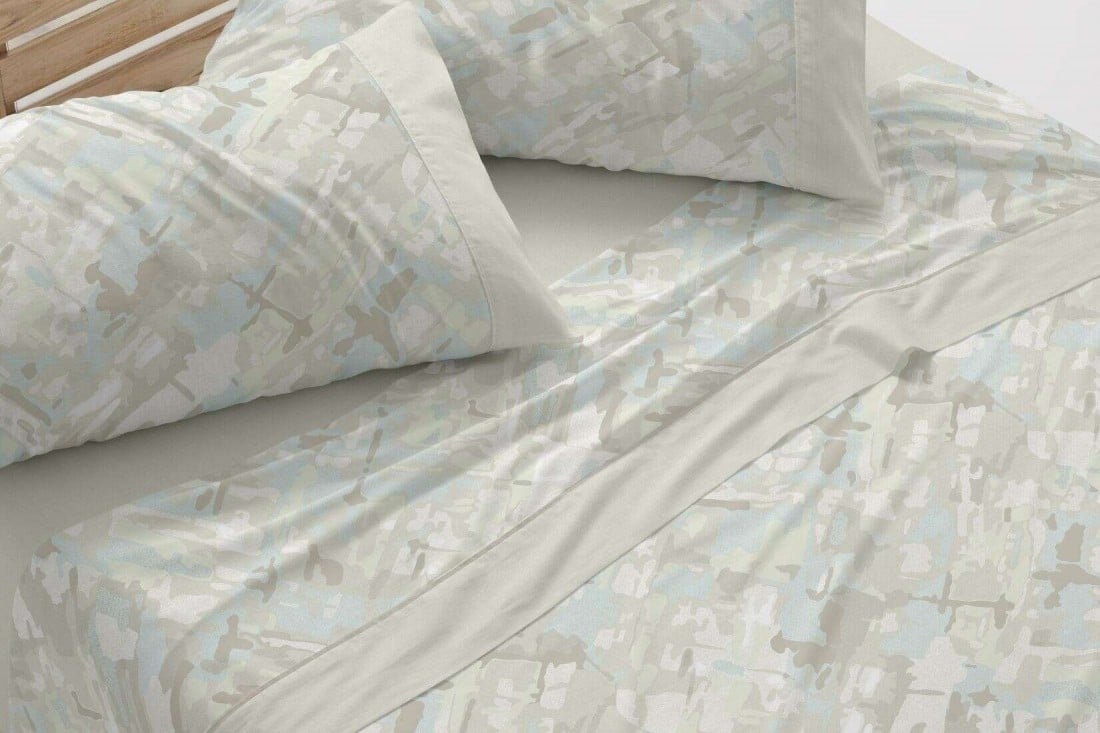 Juego de sábanas en color verde con un estampado abstracto de formas irregulares, como un camuflaje suavizado, que encaja con la serenidad del estilo Japandi y el gusto wabi-sabi por las texturas naturales.