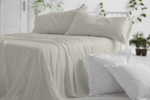 Juego de sábanas de estética geométrica tipo patchwork, con pequeñas rayitas diagonales en tono crudo sobre un fondo de color azul grisáceo. La composición recuerda al rigor funcional de la Bauhaus y a la serenidad del diseño escandinavo, con un sutil guiño al Op Art en la alternancia de direcciones.
