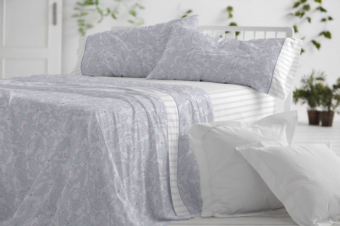 Juego de sábanas de inspiración paisley en tono azul, con puntitos y finas rayas que recuerdan al origen persa e indio de este motivo clásico, reinterpretado con un aire boho-chic y la claridad serena del estilo escandinavo.