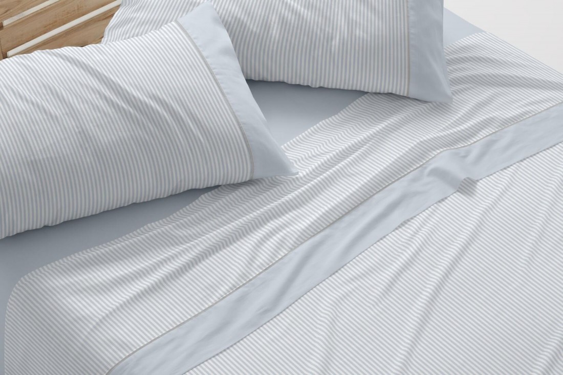 Juego de sábanas de algodón 100% con rayas verticales finas en color azul sobre fondo blanco, un guiño a la camisería clásica inglesa reinterpretada desde el minimalismo y el estilo escandinavo.