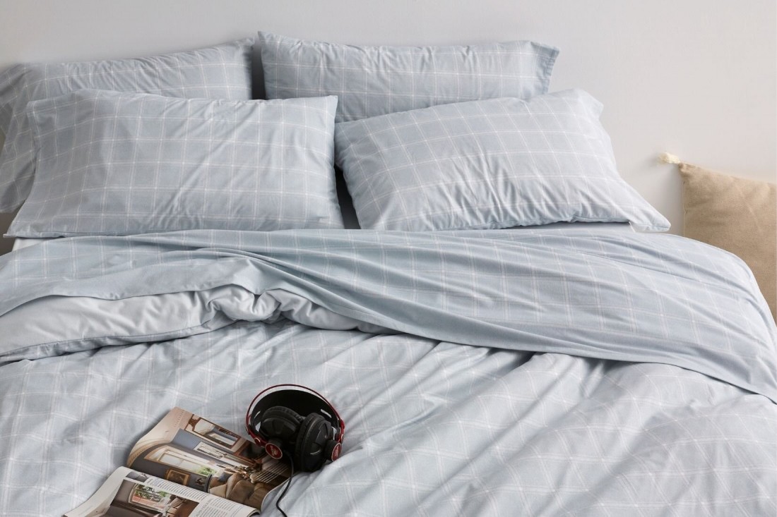 Sábanas de Velvelina® de Burrito Blanco, en estampado geométrico de cuadros con textura en color acero. Las sábanas de Velvelina®, de tacto aterciopelado, ideales para crear evocar la calma del estilo nórdico. El embozo de la sábana encimera y la sábana bajera ajustable en acero liso. Juegos de sábanas de Velvelina®, perfectos como ropa de cama de invierno. Estilo Nórdico/Hygge está asociados con la paleta de colores nórdica, que busca la calma y la conexión con la naturaleza.